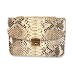 Bolso semicircular ,rígido, con solapa de cierre tipo torniquete.