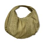 Bolso de piel pitón con el interior forrado en gamuza. Asa de altura ajustable con trenzado a mano de cuerda de piel y algodón. Cierre con botón metálico . Un bolsillo interior con cremallera, cuatro bolsillos exteriores abiertos. Material: piel de pitón