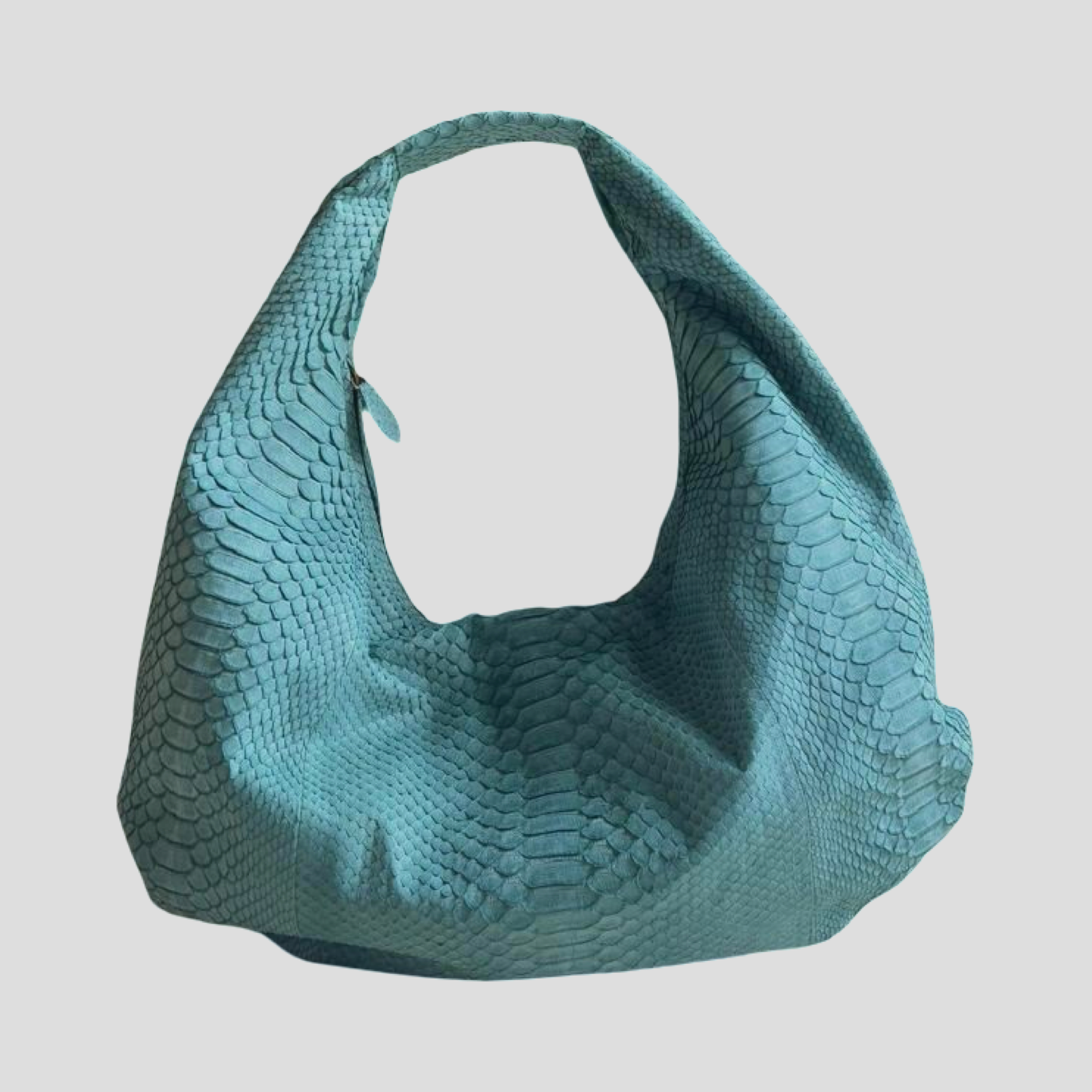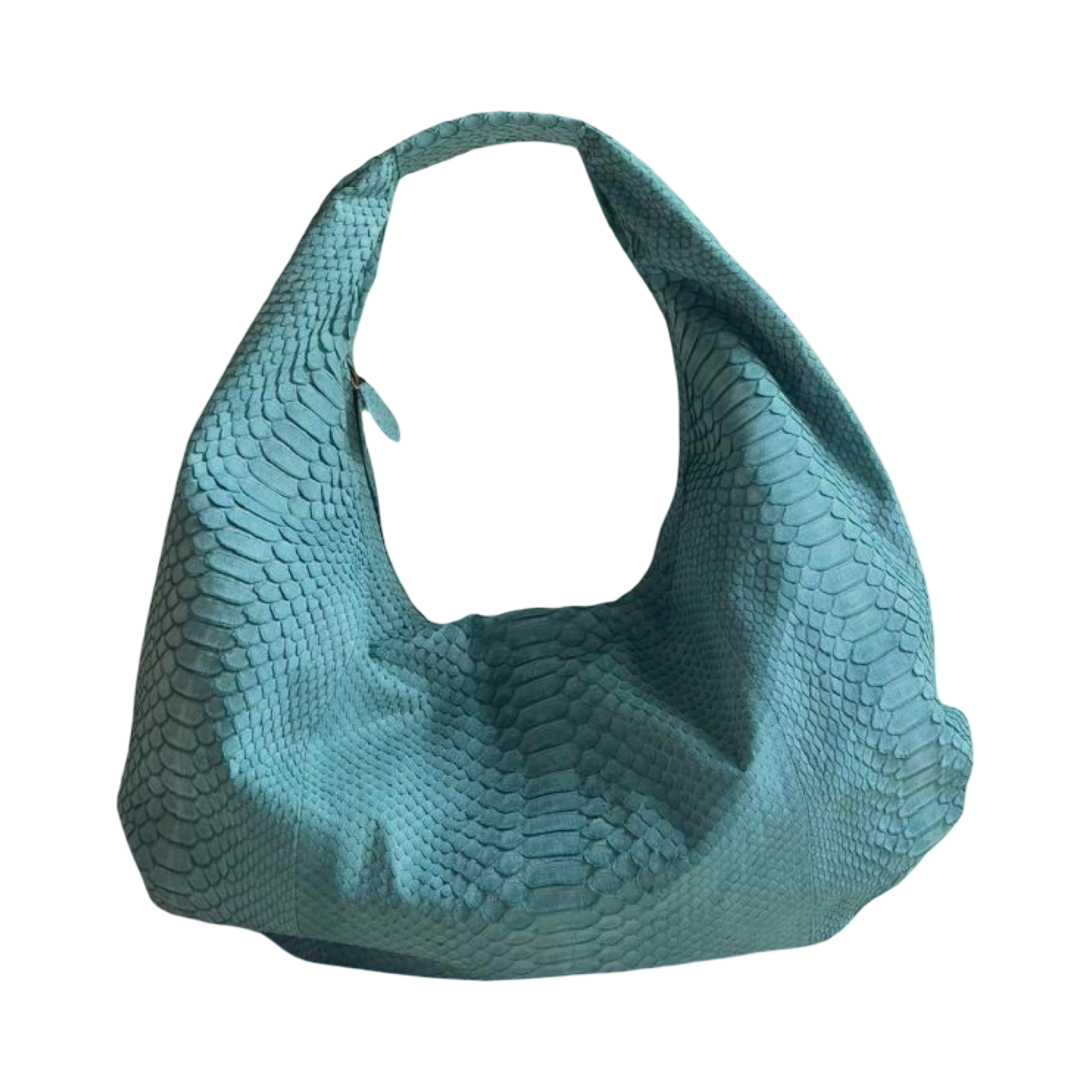 Saco blando, muy ligero, el asa se adapta perfectamente al hombro, cierre con cremallera. En su interior, un bolsillo con cremallera y dos abiertos, todo con detalles en piel de pit贸n.