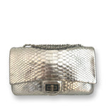 Bolso rígido, rectangular con solapa. Cierre tipo torniquete. Cadena con piel trenzada. Interior con bolsillo de cremallera. Acabados Plateados.
