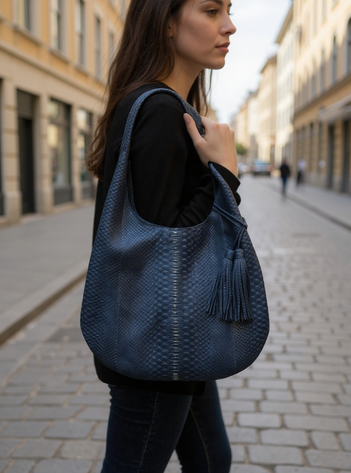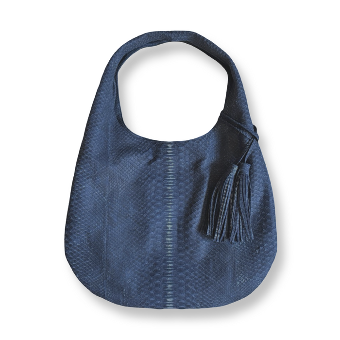 Saco redondo , plano , muy liguero y amplio , cierre con botón de imán ,borla colgante ,Interior con dos bolsillo abiertos y uno cerrado con cremallera todos rematados en piel de pitón , forro interior de gamuza .