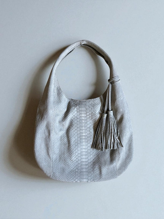 Saco redondo , plano , muy liguero y amplio , cierre con botón de imán ,borla colgante ,Interior con dos bolsillo abiertos y  uno cerrado con cremallera todos rematados en piel de pitón , forro interior de gamuza .